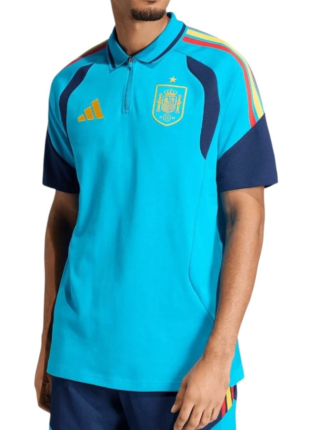 El diseño tipo polo incorpora un cuello clásico que aporta una imagen ordenada y versátil. Además, el corte está pensado para ofrecer un ajuste cómodo sin limitar el movimiento natural del cuerpo. Por otra parte, los detalles institucionales refuerzan la identidad de la selección española de forma discreta y equilibrada.