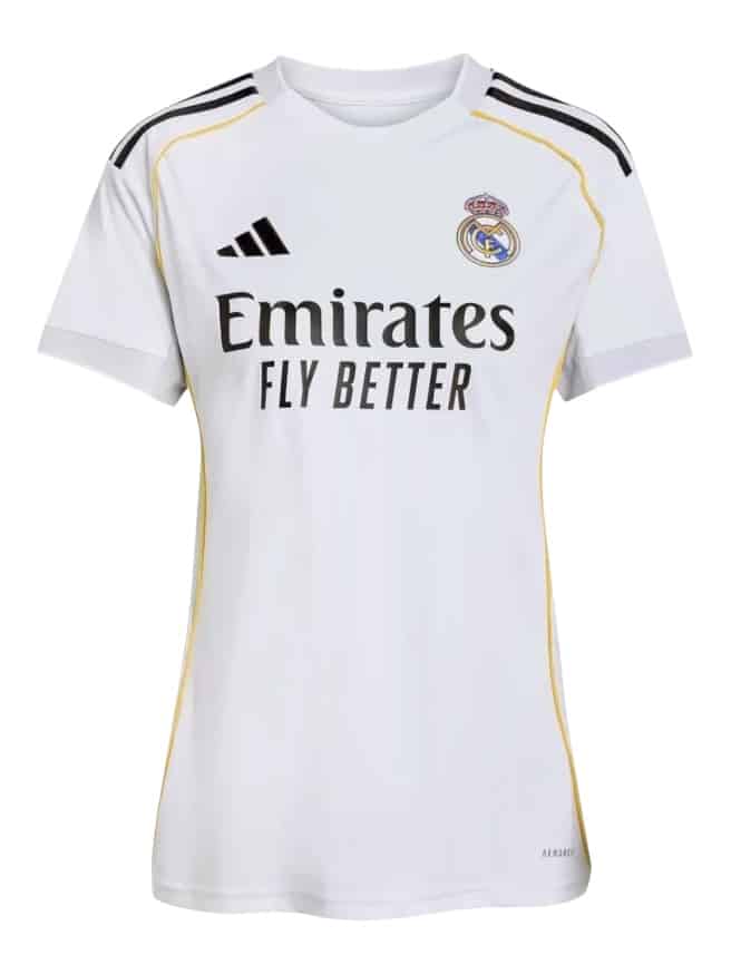 El modelo Titular 2025/26 presenta el clásico blanco del Real Madrid con detalles en dorado y negro que aportan un toque renovado. Asimismo, el escudo bordado ofrece un acabado elegante y resistente. Por otra parte, los elementos en mangas y cuello complementan la composición sin sobrecargarla. Este enfoque estético combina tradición y modernidad de forma equilibrada.